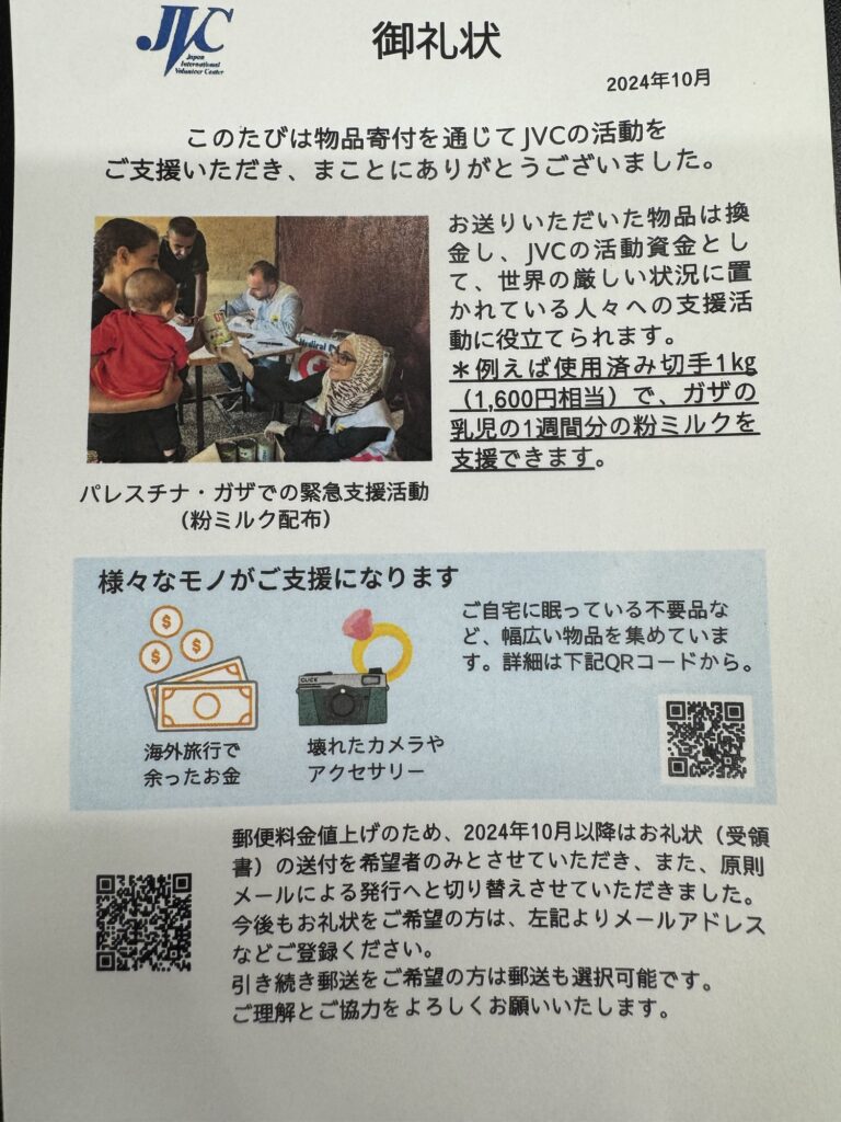 会社に届く郵便物の使用済み切手を集めてJVC日本国際ボランティアセンター様宛に郵送していたやつのお礼状が、先日届きました。